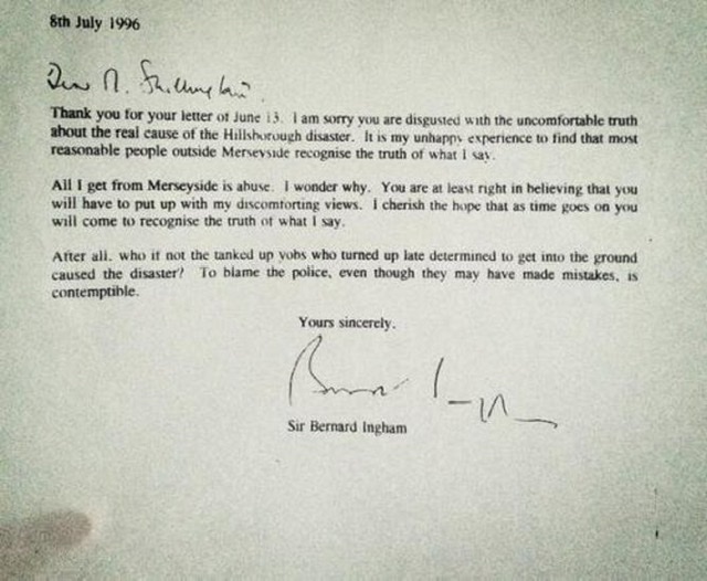 It went on when the Sun printed lies that the fans had urinated on Police Officers trying to help people. When Margaret Thatcher’s Press Secretary, the odious Bernard Ingram, repeated the claim that the fans were drunk and had caused the tragedy. (He even wrote to a Liverpool supporter saying that he thought that ‘people should just shut up about Hillsborough’. He also said ‘least said, soonest mended for Liverpool’.) Needless to say, Ingram didn’t lose anyone that day…